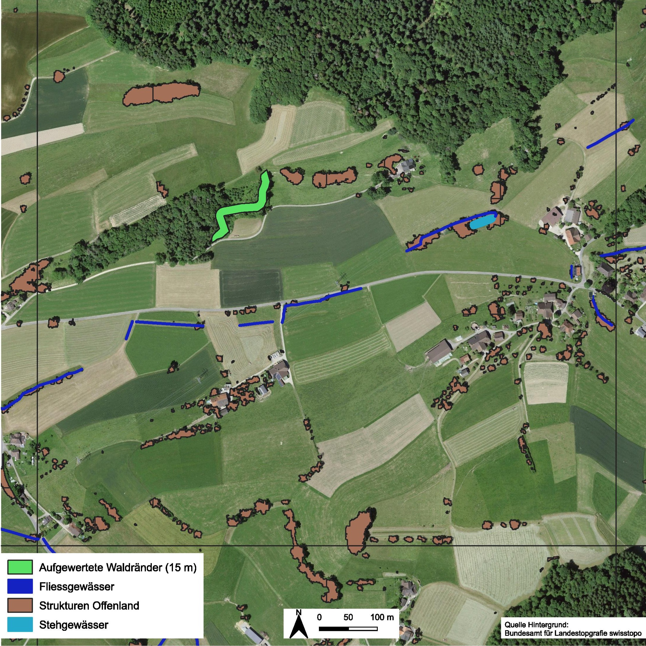 Als ökologische Strukturen gelten alle Gehölze, die anhand des Vegetations-Höhenmodells NFI (Ginzler 2021) aus mindestens 2.4 m Höhe und 3 m² Fläche bestehen. Aufgewertete Waldränder wurden berücksichtigt. Die Daten stammen vom Amt für Wald des Kantons Bern und dem Amt für Wald, Jagd und Fischerei des Kantons Solothurn. Auch kleine Stehgewässer (unter 5‘000 m²) sowie oberirdische Fliess- und Nebengewässerwurden einbezogen. Diese Daten sind über die Geoportale der Kantone Bern und Solothurn verfügbar. Die Ausdehnung der Strukturen wurde mit einer Pufferzone von 1.5 m versehen.
