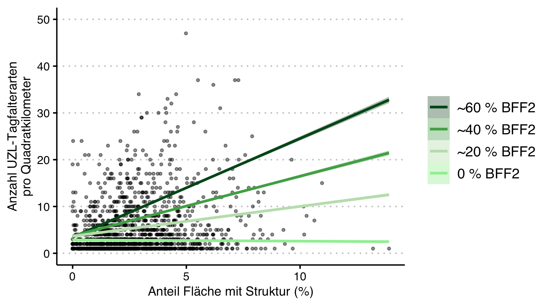 Beitrag ökologischer Strukturen zur Wirksamkeit von Biodiversitätsförderflächen Der positive Effekt ökologischer Strukturen auf die Anzahl der UZL-Tagfalterarten verstärkte sich mit zunehmendem Anteil an BFF2 im Offenland (Abbildung 3). Besonders in Kombination mit extensiv bewirtschafteten Lebensräumen entfalten diese Strukturen eine stärkere Wirkung, da sie den Lebensraum vergrössern, den Artenpool erweitern und die Lebensräume vernetzen.