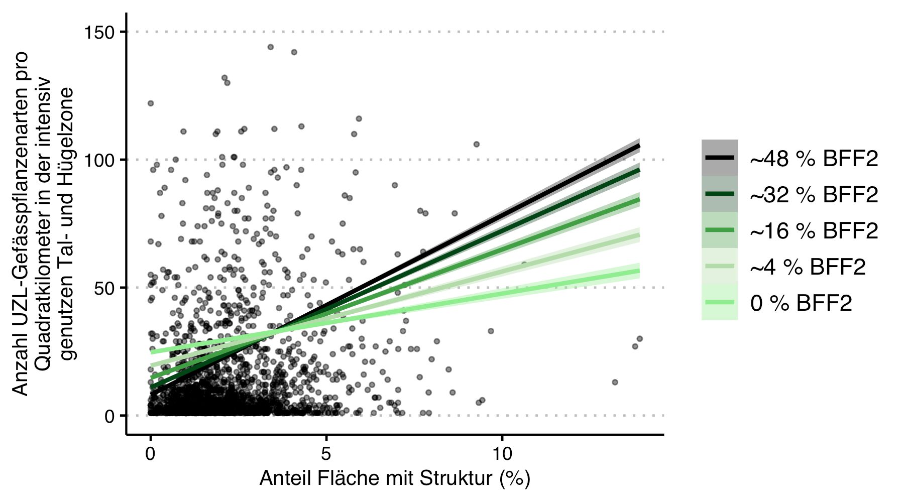 Während der Anteil an Flächen mit Struktur im Offenland maximal 13.9 Prozent erreichte, lagen die BFF2-Anteile bei bis zu 61.7 Prozent. Jedoch verdeckt die grössere Bandbreite, dass die Hälfte der untersuchten Quadratkilometer nur einen BFF2-Anteil von 2.7 Prozent im Offenland aufwies (Median). Der Anteil der Flächen mit Strukturen war ähnlich niedrig und lag bei 2.4 Prozent. Der positive Einfluss der BFF2-Flächen auf Pflanzen und Brutvögel konnte dennoch nachgewiesen werden, dieser war im Gegensatz zu den Tagfaltern aber unabhängig von den Flächenanteilen mit ökologischen Strukturen (Abbildung 4). Im Gegensatz zur Bergzone wird die Tal- und Hügelzone intensiver bewirtschaftet. Betrachtet man nur diese intensiv genutzten Landschaften, zeigte sich auch bei den Gefässpflanzen, dass die Kombination aus ökologischen Strukturen und extensiv bewirtschafteten Flächen die Artenvielfalt deutlicher fördert. Der positive Effekt des Strukturanteils auf die Artenzahl der UZL-Gefässpflanzen pro Quadratkilometer verstärkte sich mit zunehmendem Anteil an BFF2. Dies bestätigt, dass sich sowohl die Dichte an ökologischen Strukturen als auch die Ausdehnung und Vernetzung der umgebenden Lebensräume positiv auf die Artenvielfalt auswirken.