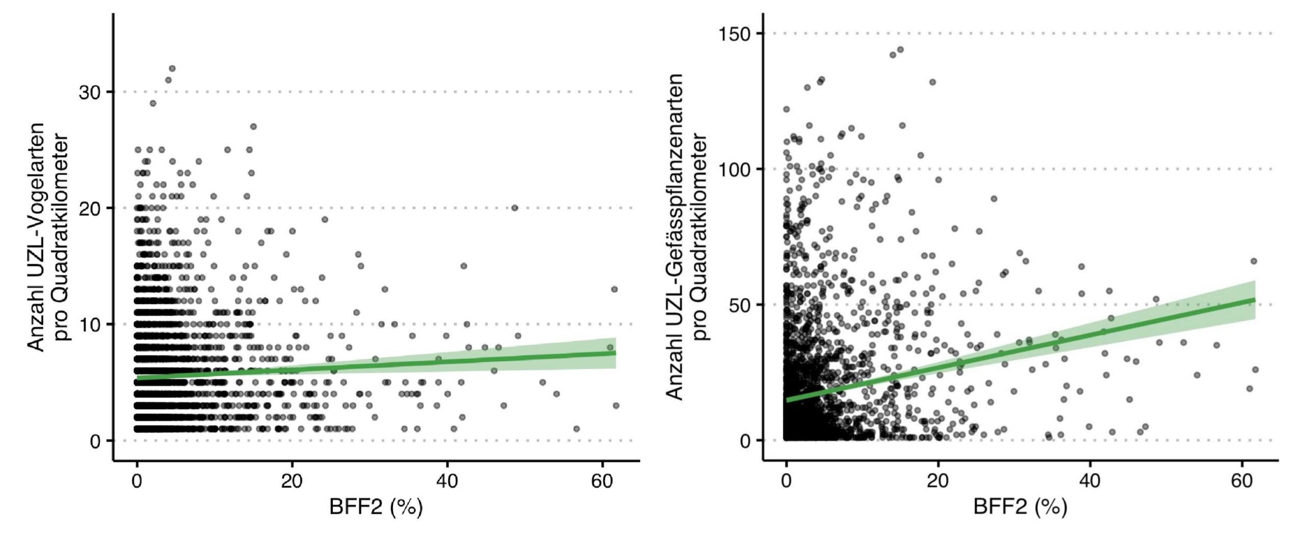 Der Anteil ökologischer Strukturen und Biodiversitätsförderflächen Kategorie 2 (BFF2) wurde pro Quadratkilometer berechnet (Abbildung 1). Der Einfluss der Anteile auf die Artenzahlen wurde mit statistischen Modellen analysiert (GLMMs mit Poisson-verteilten Fehlern, die auf Überdispersion korrigiert wurden).