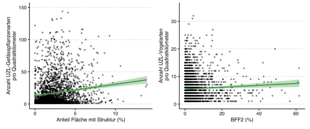 L’étude met en lumière la corrélation positive qui existe entre la proportion de structures écologiques en milieu ouvert et la diversité des espèces OEA. Cet effet ne concerne pas uniquement les plantes vasculaires. Pour les papillons, tributaires de la qualité des herbages, et les espèces mobiles telles que les oiseaux, les structures écologiques amènent une augmentation du nombre d’espèces.
